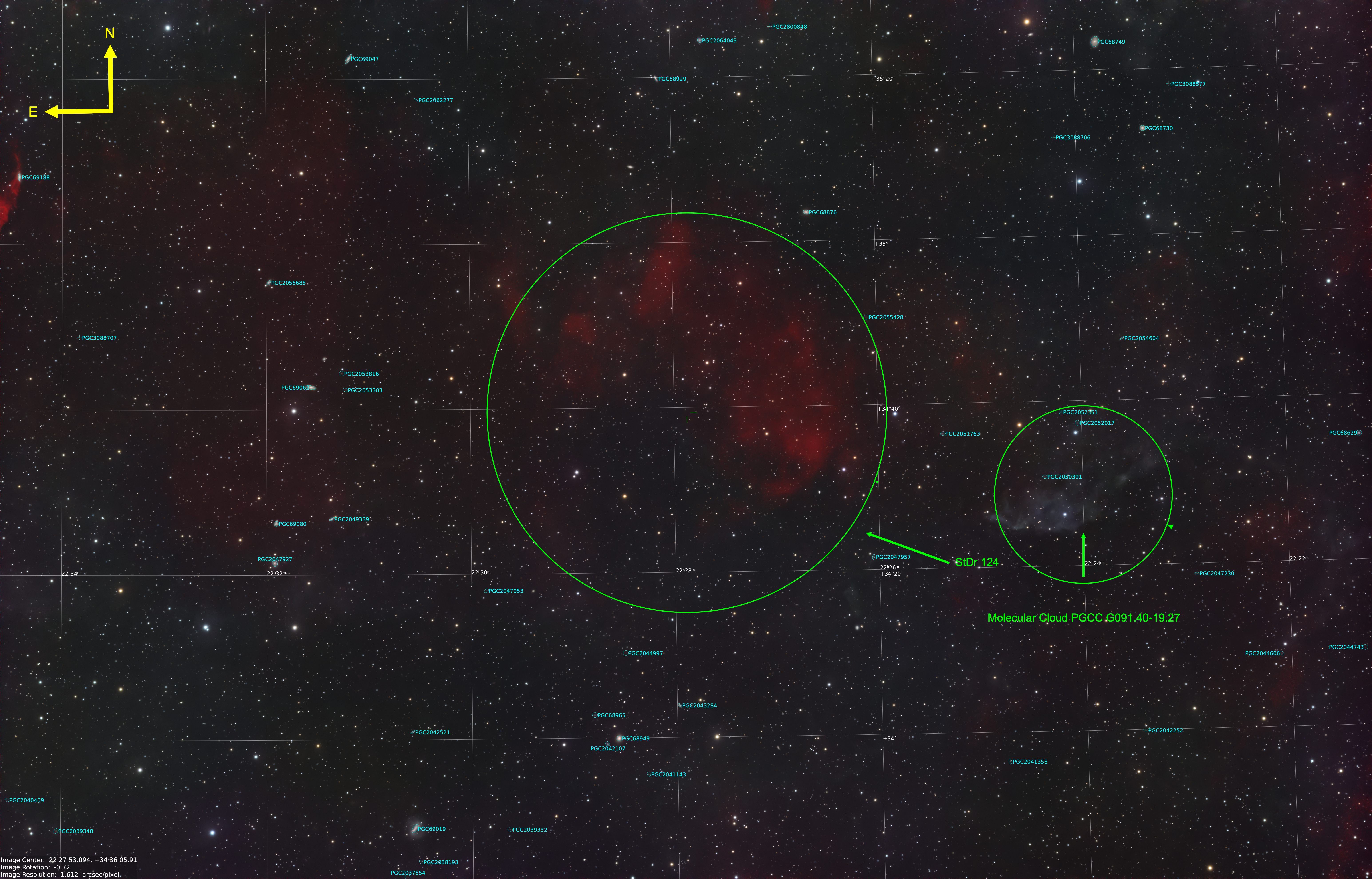 Strottner-Drechsler 124 (StSr124) is a planetary nebula candidate in the constellation Pegasus. It's fairly large with a size of approximately 33 arc min. StDr124 seems to have only H𝛼 emission. I did not detect any appreciable [OIII] emission. StDr 124 is really faint and required considerable stretching to be visible. To me it StDr 124 seems more like a ISM nebula but will leave that to the professionals to determine. Also within the image is an area of molecular dust call PGCC G091.40-19.27. Other very faint H𝛼 emission is visible barely above the background. Quite a few faint PGC galaxies also are present in this field. The image was taken with Stellarvue SV 80s f6 refractor along with a ZWO ASI 2600 MC pro camera. The H𝛼/OIII data was taken using a Antlia ALP-T 5nm H𝛼/OIII filter. Total exposure time 22.23 hrs.