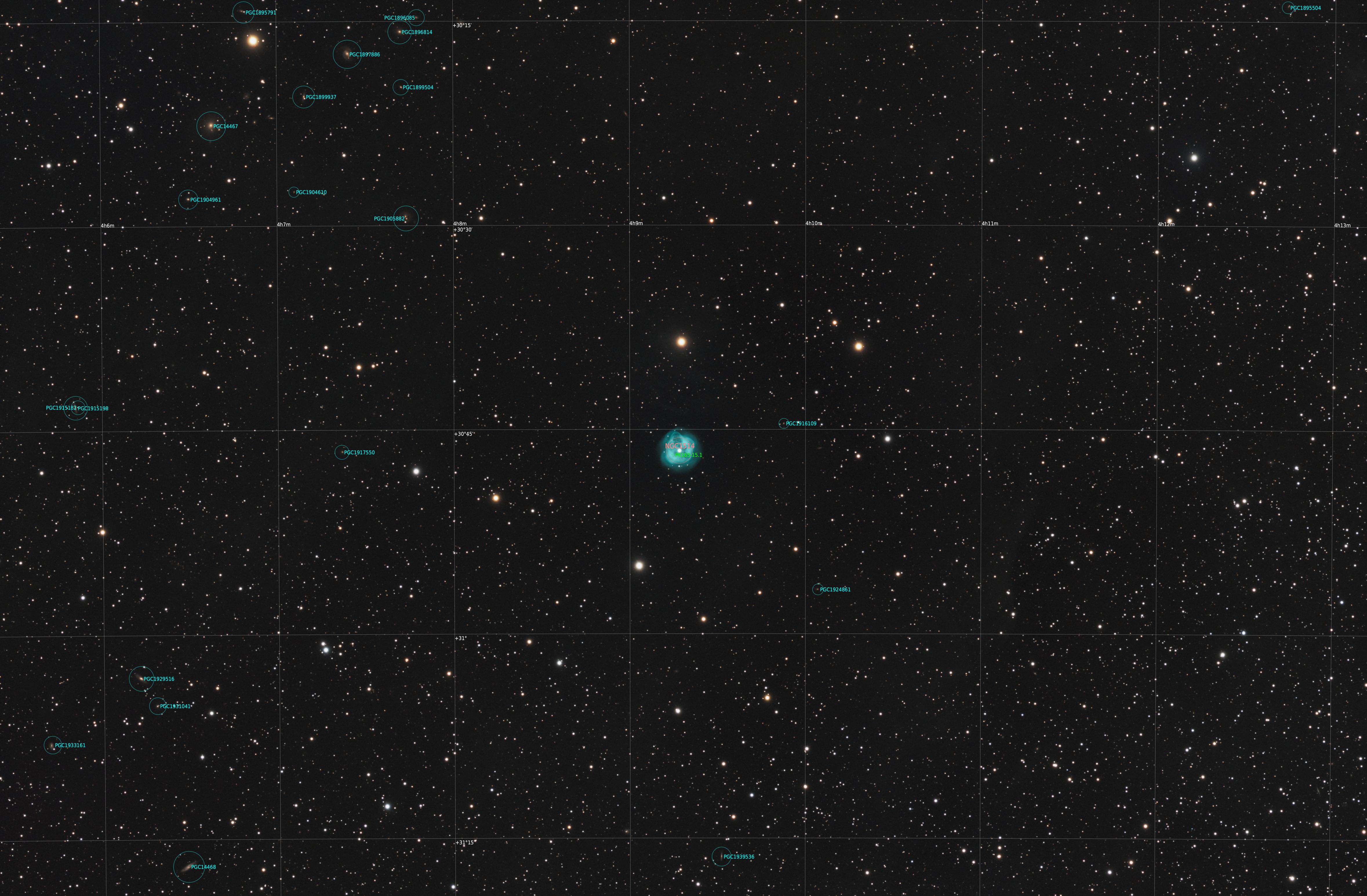 NGC 1514 is a dim planetary nebula in the constellation Taurus. It goes by several names: PK165-15.1, PN G165-15.2, ARO 21 and the Crystal Ball nebula. NGC 1514 is fairly dim at magnitude 10.8 and is 2.2x2 arc min in size. It lies roughly 2,400 light years distant and has a diameter of 1.6 light years. Wiki: https://en.wikipedia.org/wiki/NGC_1514. NGC 1514 also sits within a large area of dust. The dust is faint but you can probably see it in the full un cropped image link above. I purposely didn't try to enhance the dust much but did include this inverse image where the dust shows up as darker areas of the background and less dusty or dust free areas are whitish. The stars are also inverted so they are dark. In the full uncropped field of view are a good amount of faint PGC galaxies too. Here is an annotated version labeling them. It's fun to look at the full 60 mega pixel image and check out these small galaxies.