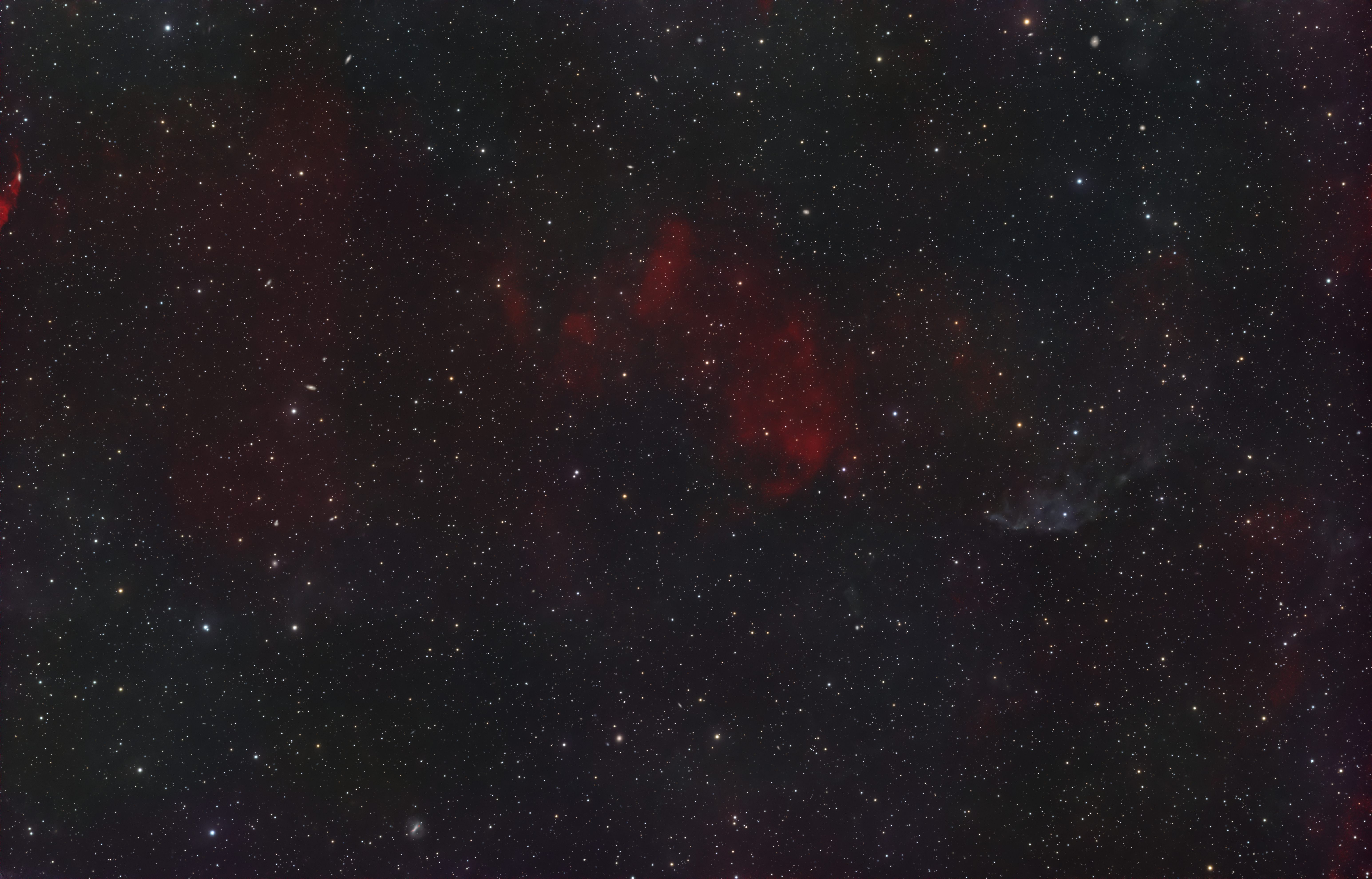 Strottner-Drechsler 124 (StSr124) is a planetary nebula candidate in the constellation Pegasus. It's fairly large with a size of approximately 33 arc min. StDr124 seems to have only H𝛼 emission. I did not detect any appreciable [OIII] emission. StDr 124 is really faint and required considerable stretching to be visible. To me it StDr 124 seems more like a ISM nebula but will leave that to the professionals to determine. Also within the image is an area of molecular dust call PGCC G091.40-19.27. Other very faint H𝛼 emission is visible barely above the background. Quite a few faint PGC galaxies also are present in this field. The image was taken with Stellarvue SV 80s f6 refractor along with a ZWO ASI 2600 MC pro camera. The H𝛼/OIII data was taken using a Antlia ALP-T 5nm H𝛼/OIII filter. Total exposure time 22.23 hrs.
